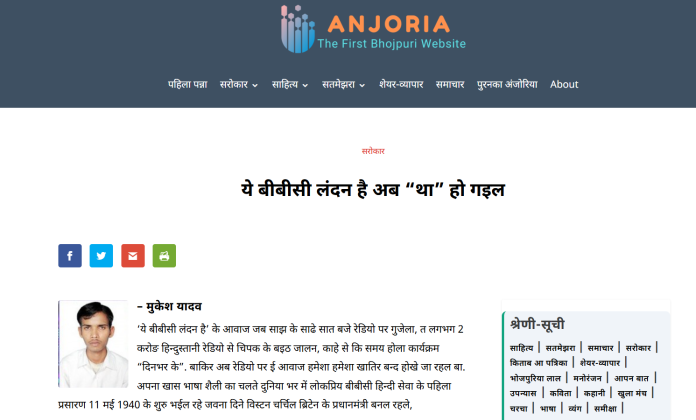 बीबीसी हिन्दी सेवा के बन्द होखल एगो संकेत बा कि भाषायी पत्रकारिता के तरह गँवे गँवे दम तोड़ रहल बा. अगर कहीं कि बड़ बड़ जने दहाइल जासु गदहा पुछस कतना पानी त उहे हालत बा भोजपुरी पत्रकारिता के जवन अबही ठीक से जनमलो नइखे. पता ना आवे वाला दिन में भोजपुरी पत्रकारिता के सोगहग रुप देखे के मिली कि ना. हम त बीबीसी के हिन्दी सेवा के बन्द होखला के गम मनावत बानी बाकिर खुशी एह बात के बा कि बीबीसी हिन्दी के मोबाइल आ वेब पर मौजूदगी बनल रही.