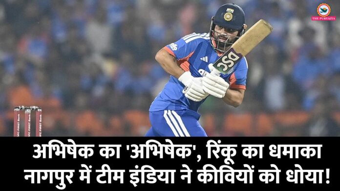 विदर्भ क्रिकेट एसोसिएशन स्टेडियम में टीम इंडिया ने कीवियों के ‘पर’ कतर दिए हैं। टॉस जीतकर न्यूज़ीलैंड के कप्तान मिचेल सैंटनर ने पहले गेंदबाज़ी का फ़ैसला किया, लेकिन अभिषेक शर्मा के इरादे कुछ और ही थे। अभिषेक ने महज़ 35 गेंदों में 83 रनों का ऐसा तूफ़ान खड़ा किया कि कीवी गेंदबाज़ मैदान के हर कोने में गेंद ढूंढते नज़र आए। रही-सही कसर ‘फिनिशर’ रिंकू सिंह ने पूरी कर दी, जिन्होंने आख़िरी ओवरों में अपनी क्लास दिखाते हुए महज़ 20 गेंदों में 44 रन कूट दिए। कप्तान सूर्यकुमार यादव के 32 और हार्दिक पंड्या के 25 रनों की बदौलत भारत ने बोर्ड पर 238 रनों का विशाल स्कोर टांग दिया।